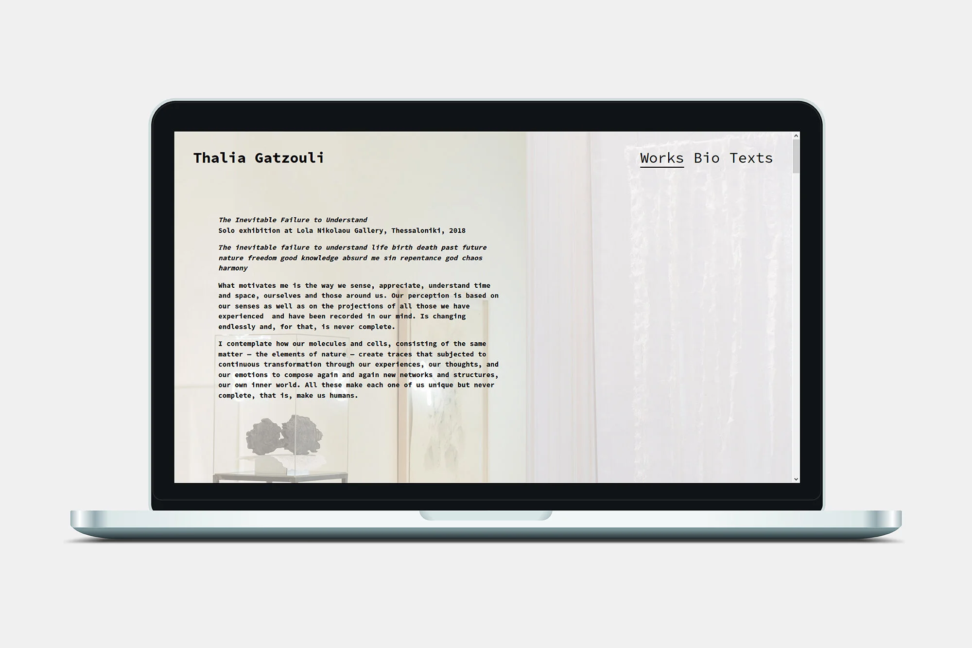 Thalia Gatzouli (b. 1966, Drama) is a Greek artist and nuclear medicine physician, living and working in Thessaloniki. The website’s objective was to function as a comprehensive online portfolio, faithfully showcasing the multifaceted nature of her work, whilst focusing on its core characteristics. To achieve this, each work is first presented through a menu system linked with corresponding full-screen photos, so that the visitor may get a grasp of the artist’s oeuvre in its entirety before focusing on any individual artworks. The navigation is simple and straightforward, albeit with a hint of dynamism, so as to as to maintain a proper balance in relation to the work’s doric formal and conceptual aspects, whilst the elements upon which the whole design approach was based are a direct reference to the artist’s own choices — some of the most prominent of them being: materiality, a muted colour palette and a clean, scientific approach.